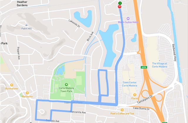 A central road that connects residential and commercial areas in Corte Madera. It’s likely to have moderate traffic, so be prepared for vehicles entering and exiting parking lots and watch out for pedestrians near crosswalks-especially around shopping centers.